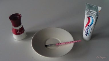- Doe een streepje tandpasta op het bordje/schaaltje.